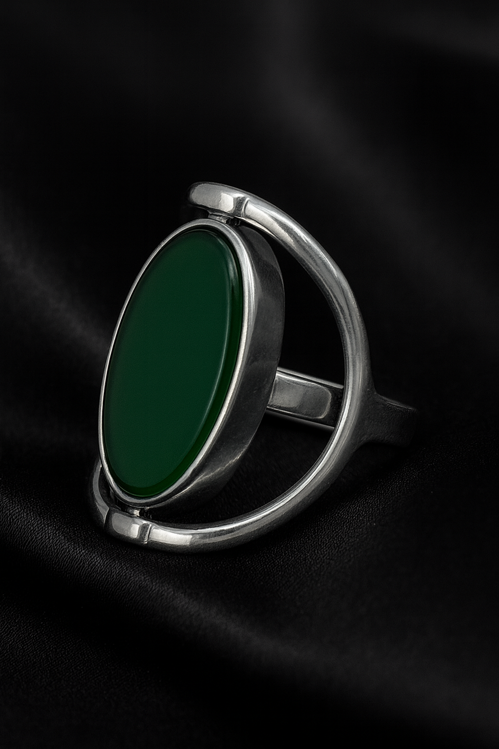 Un diseño moderno que combina líneas arquitectónicas con un toque de color profundo. Este anillo destaca por su piedra ovalada en tono negro o verde esmeralda, enmarcada por una estructura abierta de acero inoxidable que aporta ligereza y sofisticación. Su acabado crea un contraste perfecto con la intensidad del color, convirtiéndolo en una pieza ideal para quienes buscan estilo, personalidad y elegancia atemporal.