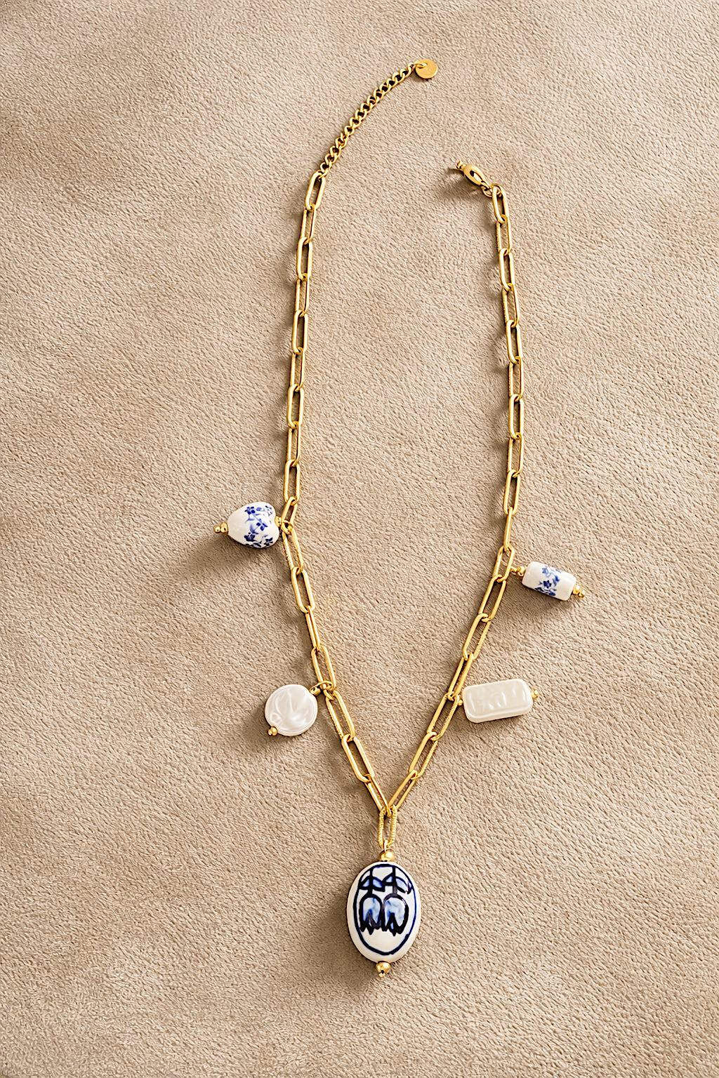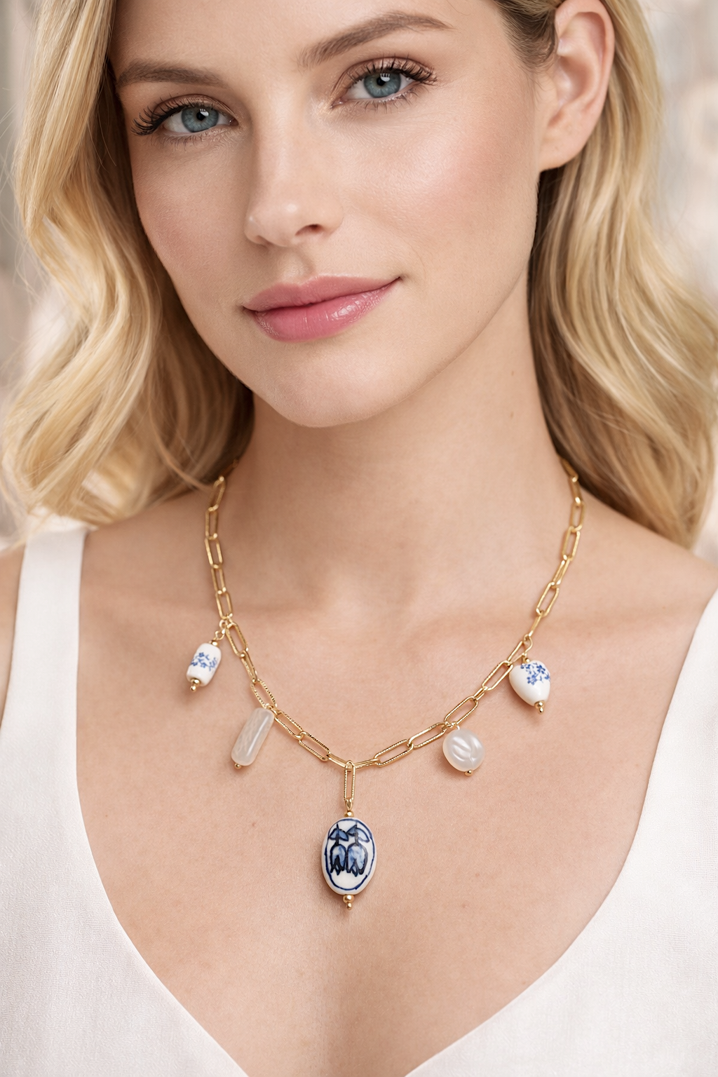 Este collar fusiona el diseño contemporáneo con un sutil aire artístico. Su cadena de eslabones dorados aporta una estética moderna y elegante, mientras que los charms de porcelana en tonos blanco y azul añaden un toque distintivo y refinado.