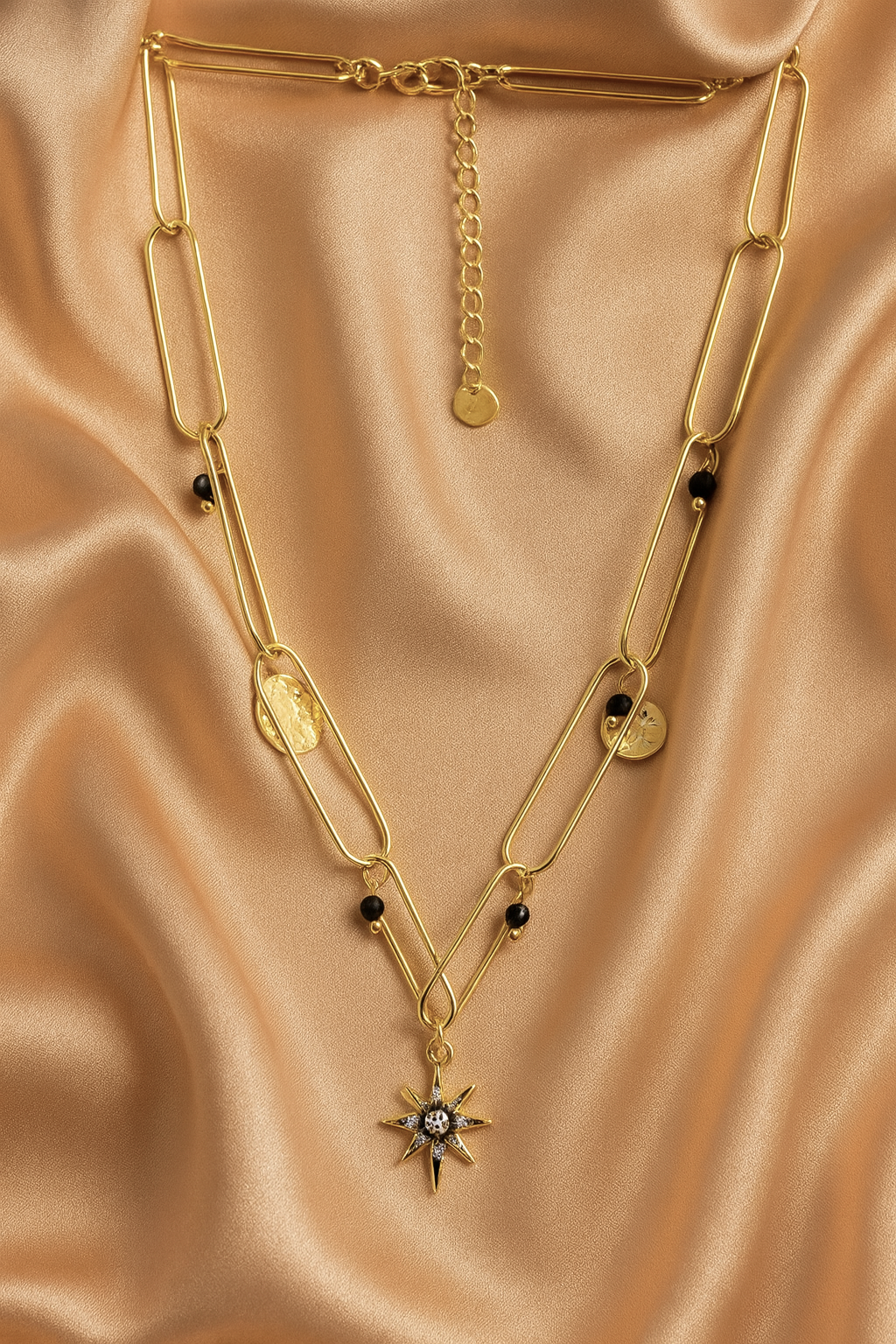 Eleva tu estilo con este collar dorado en doble capa, una pieza moderna y sofisticada que combina eslabones largos tipo paperclip con delicados detalles en cuentas negras. Su protagonista es un cautivador dije de estrella del norte, adornado con un centro oscuro que resalta su brillo dorado y le da un toque místico y contemporáneo. Un diseño llamativo, equilibrado y versátil, ideal para destacar cualquier outfit, desde lo casual chic hasta lo elegante.