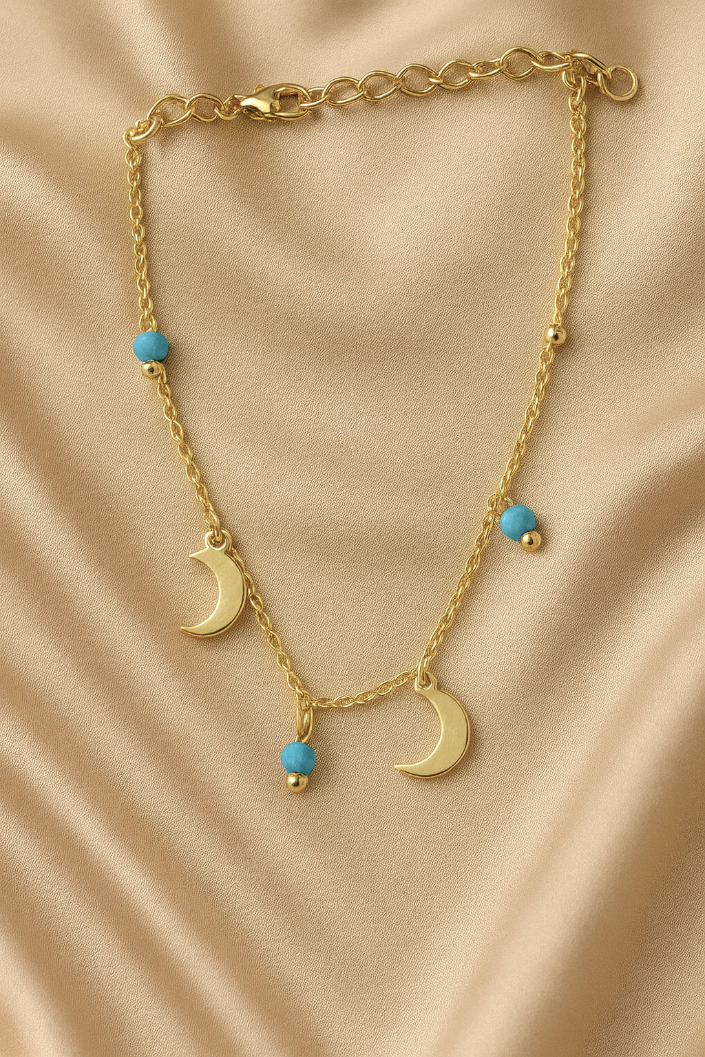 Ilumina tu estilo con esta delicada pulsera inspirada en la magia nocturna. Su diseño combina encantadores dijes de luna bañados en oro 14K con pequeñas cuentas turquesa que aportan un toque vibrante y elegante. La cadena es ligera, ajustable y perfecta para llevar sola o combinada con otras pulseras para un look más boho-chic. Ideal para regalar o para agregar un detalle místico a tu día.